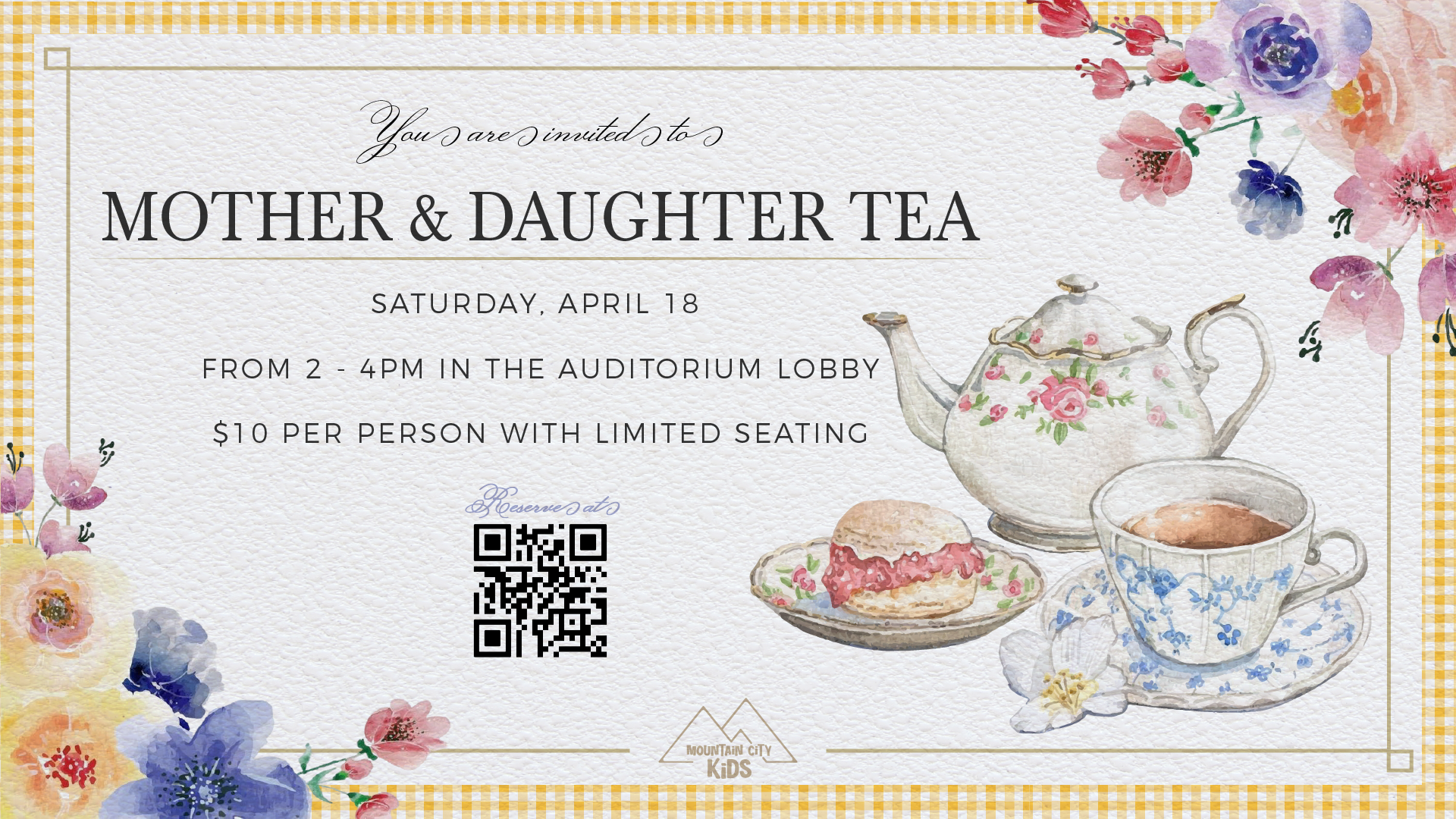 A sweet afternoon designed to celebrate the special bond between moms and daughters! Enjoy tea, delicious desserts, and meaningful moments together, along with an encouraging devotion about growing into the women God created us to be—full of grace, strength, and faith.